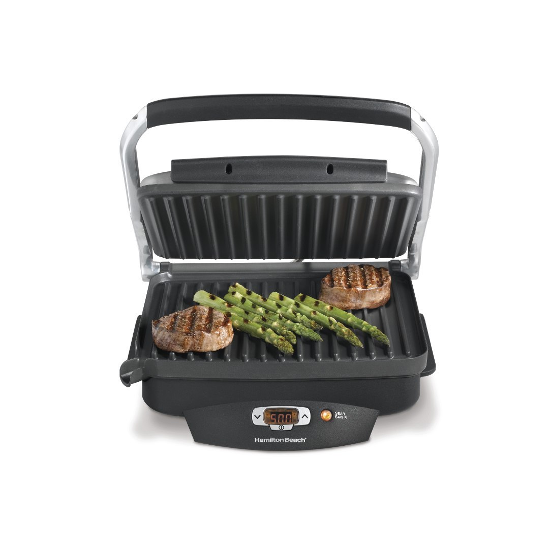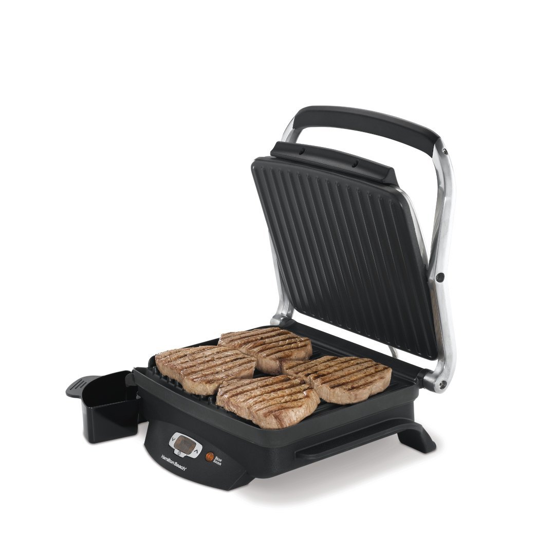 Asegura el sabor y los jugos de la carne con esta parrilla Hamilton Beach_ la cual es ideal para filetes y hamburguesas; asa a la parrilla comidas en menos de 10 minutos. Con cocción baja en grasa_ podrás drenar grasa en la bandeja de goteo extríble.